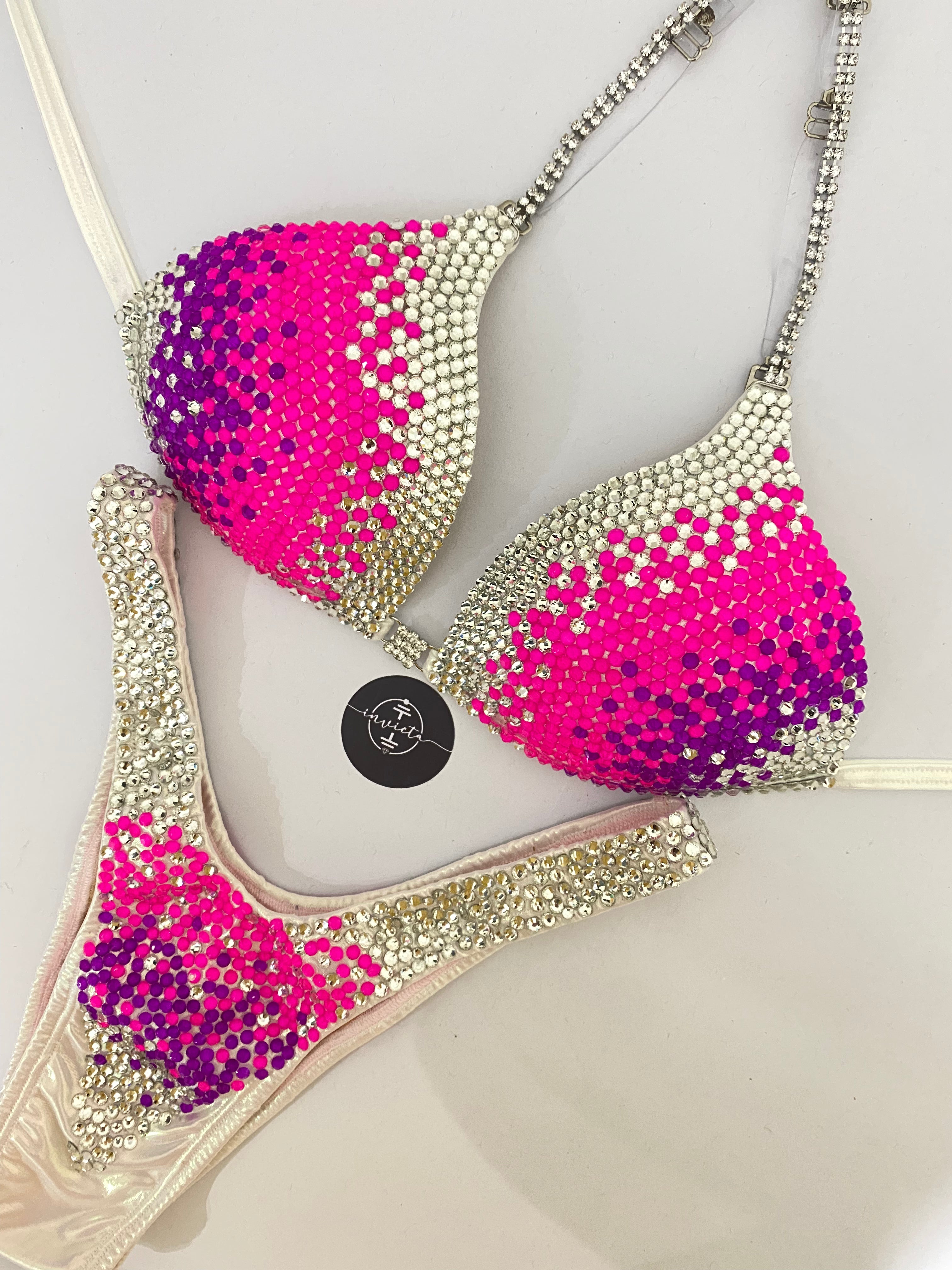 Bordado com cristais neon rosa e roxo, predominância do cristal clear.