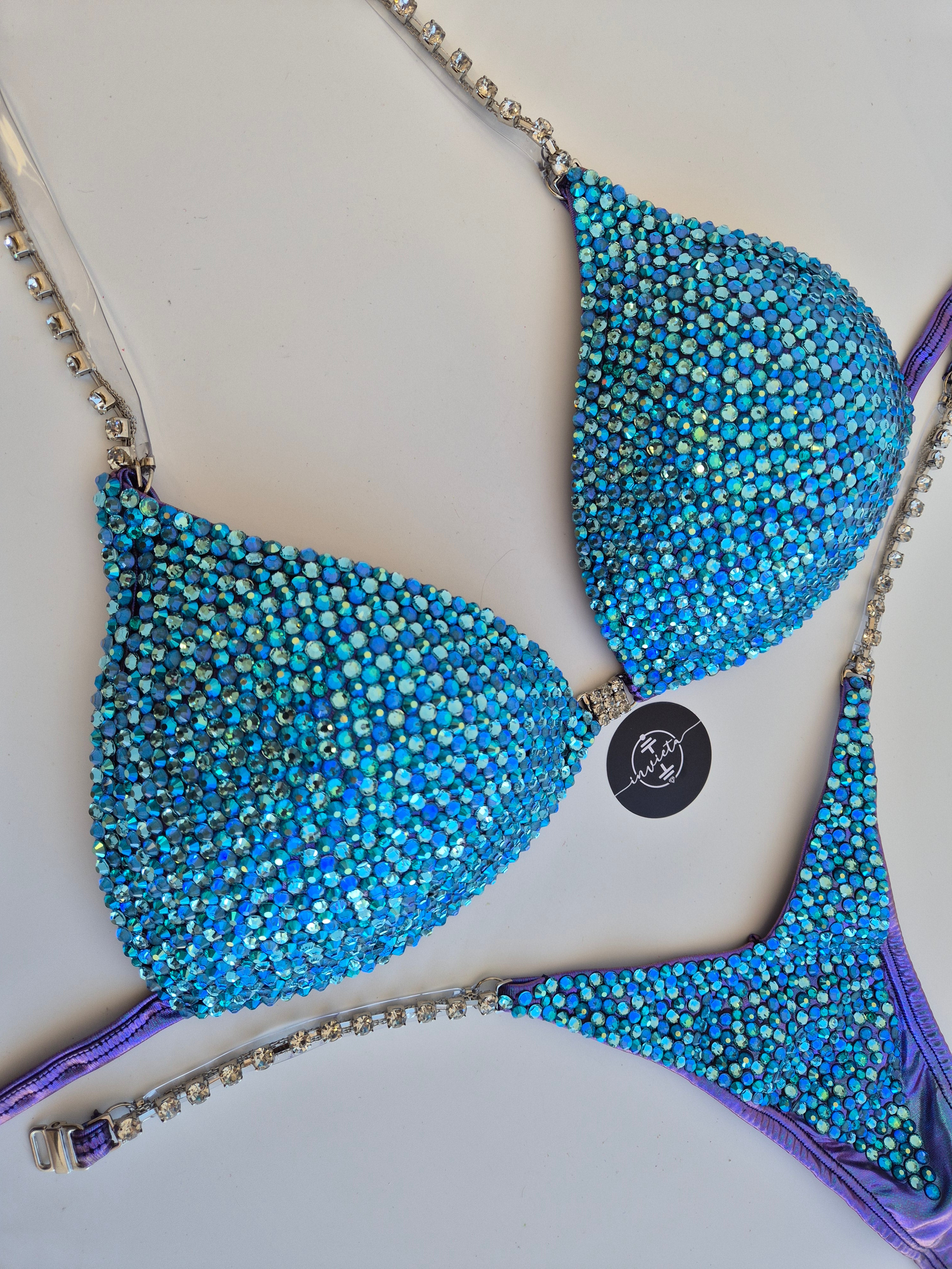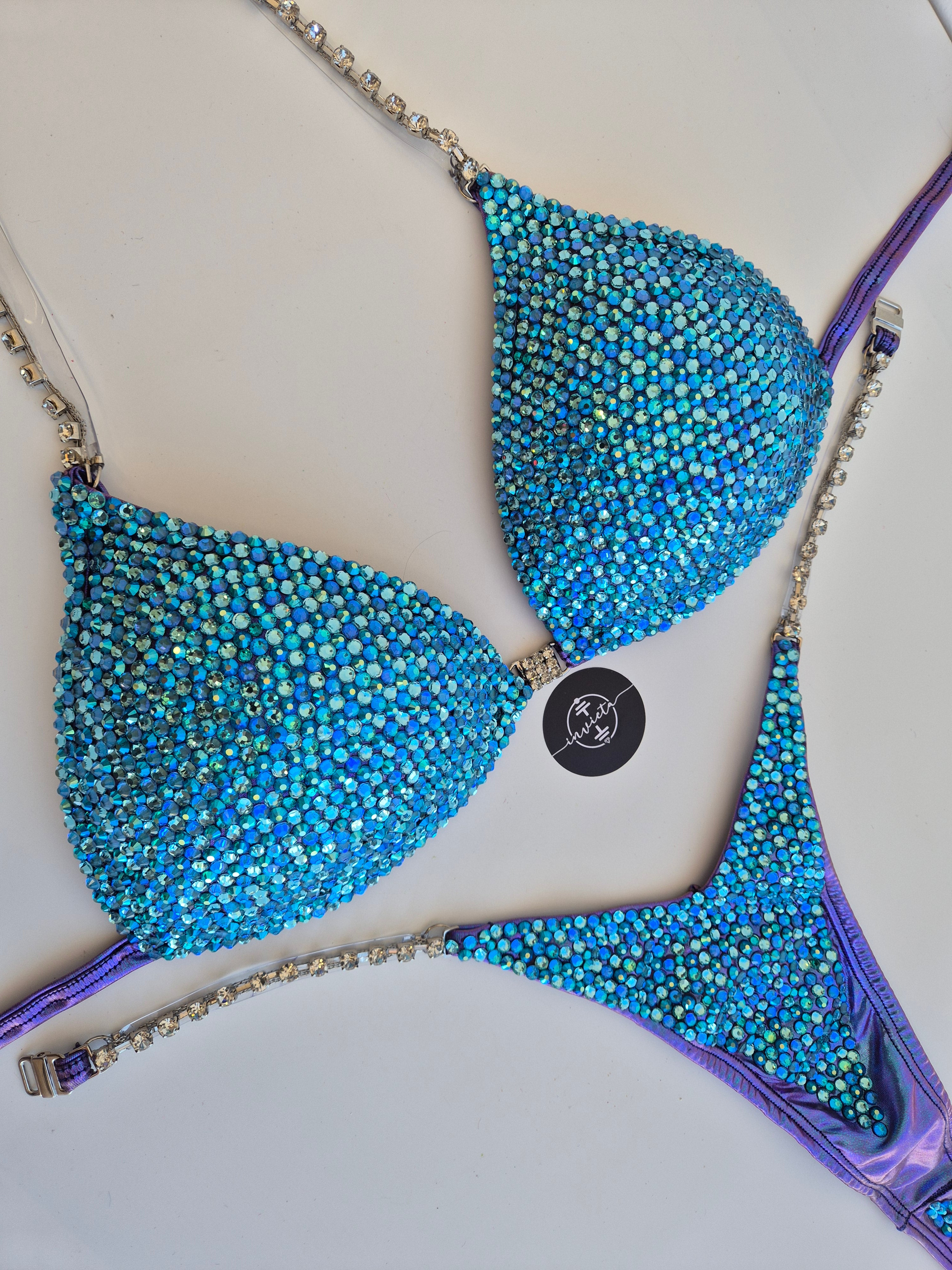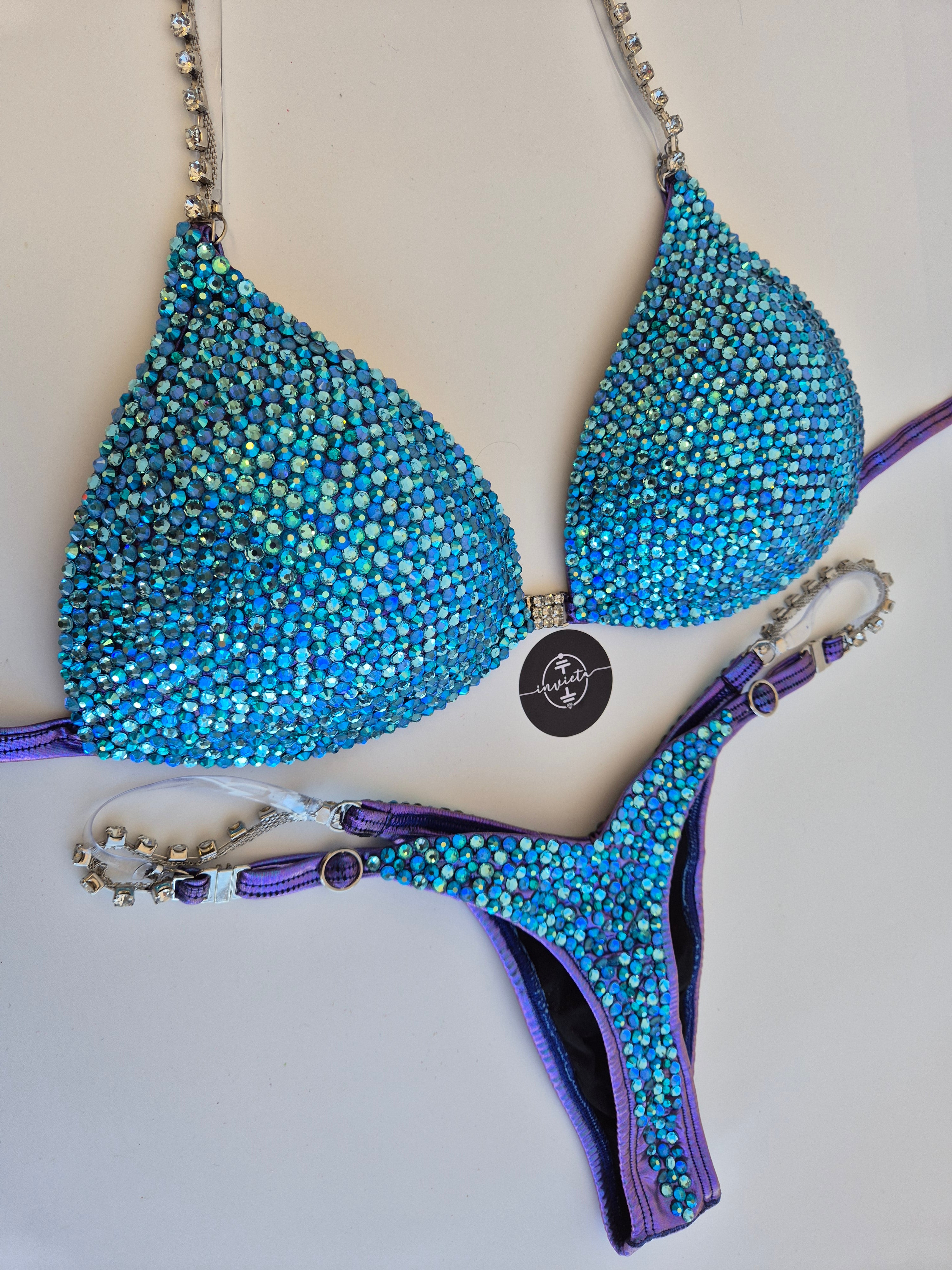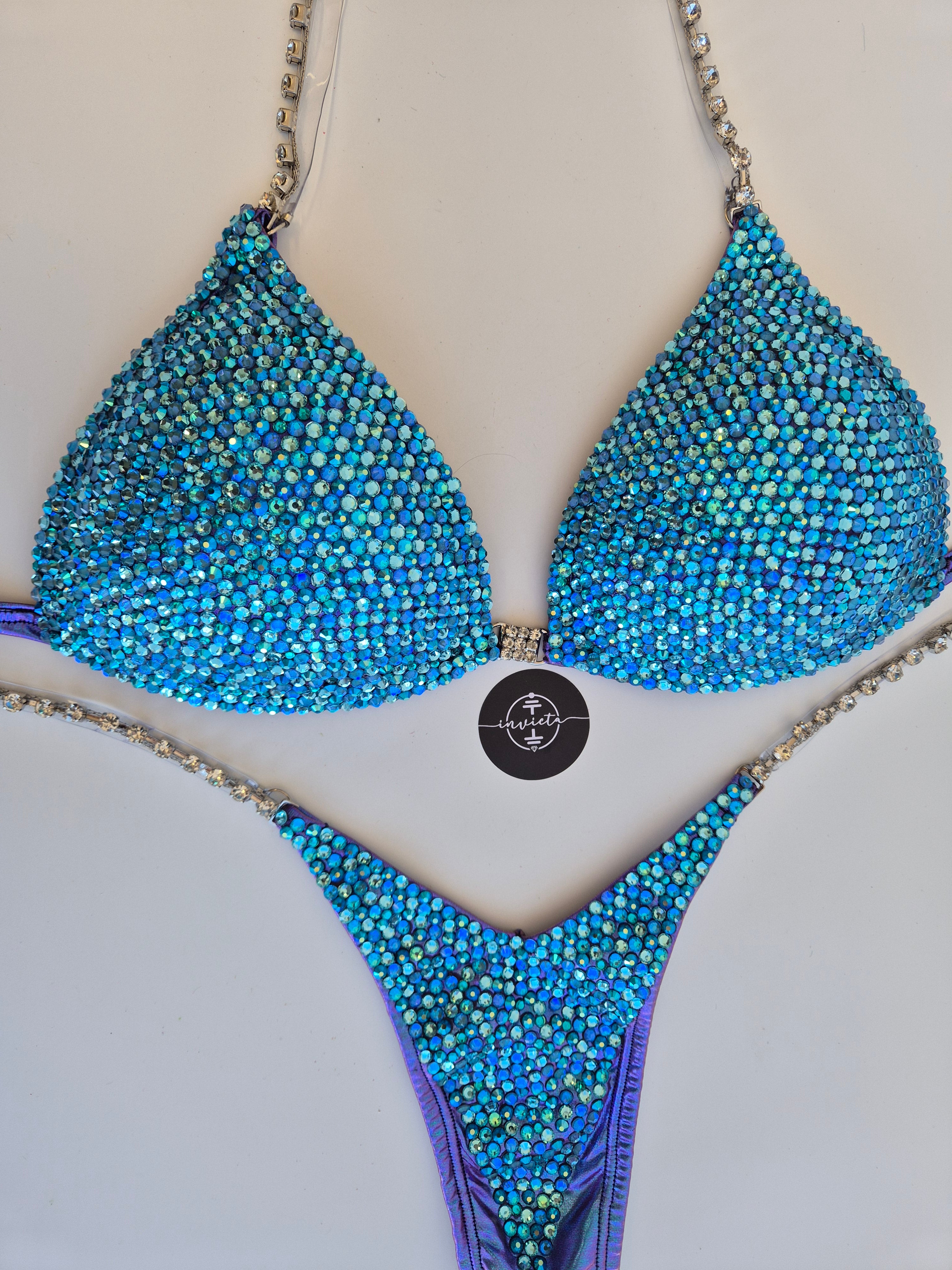 Bordado com cristais em tons variados de Azul.