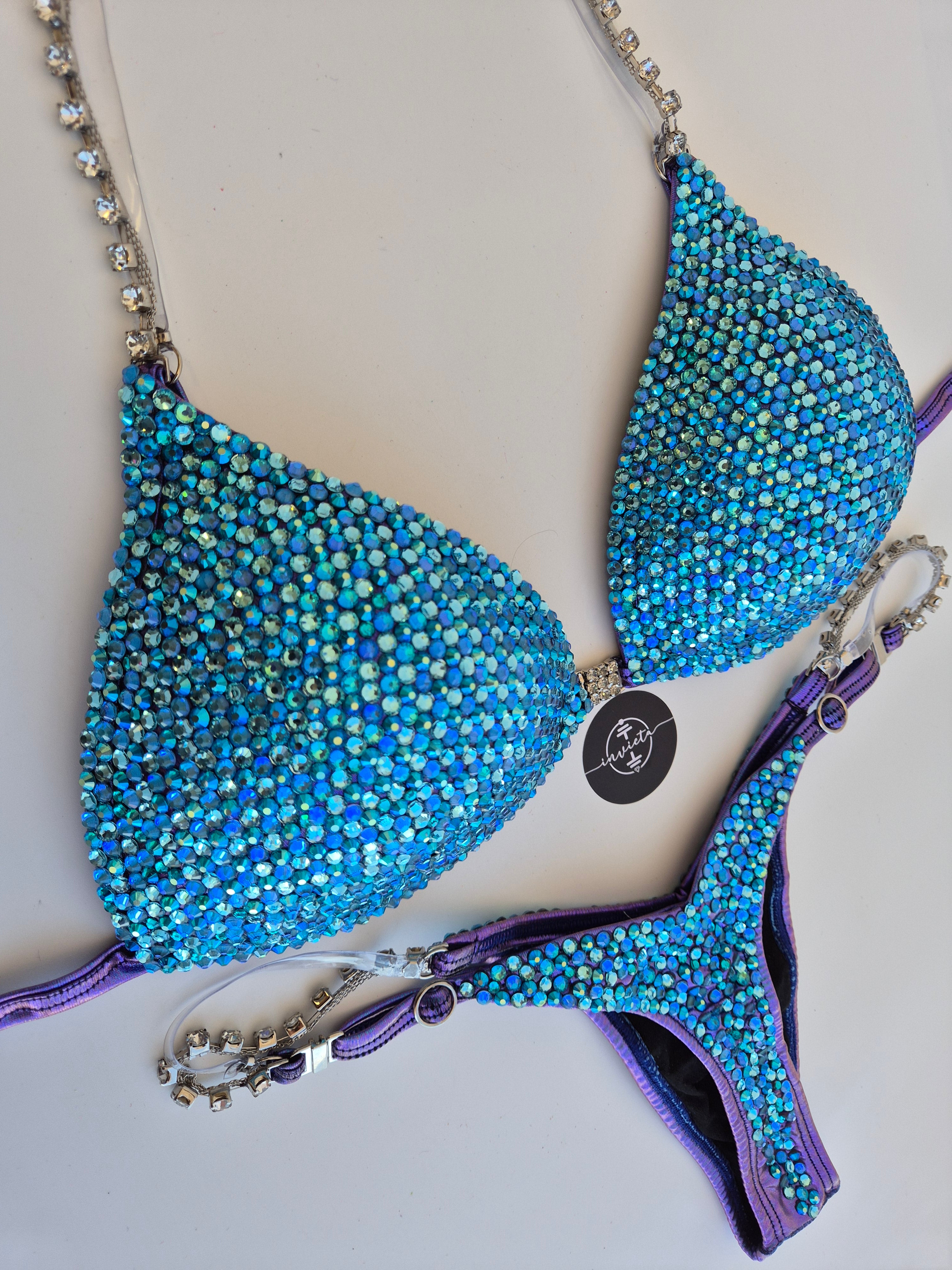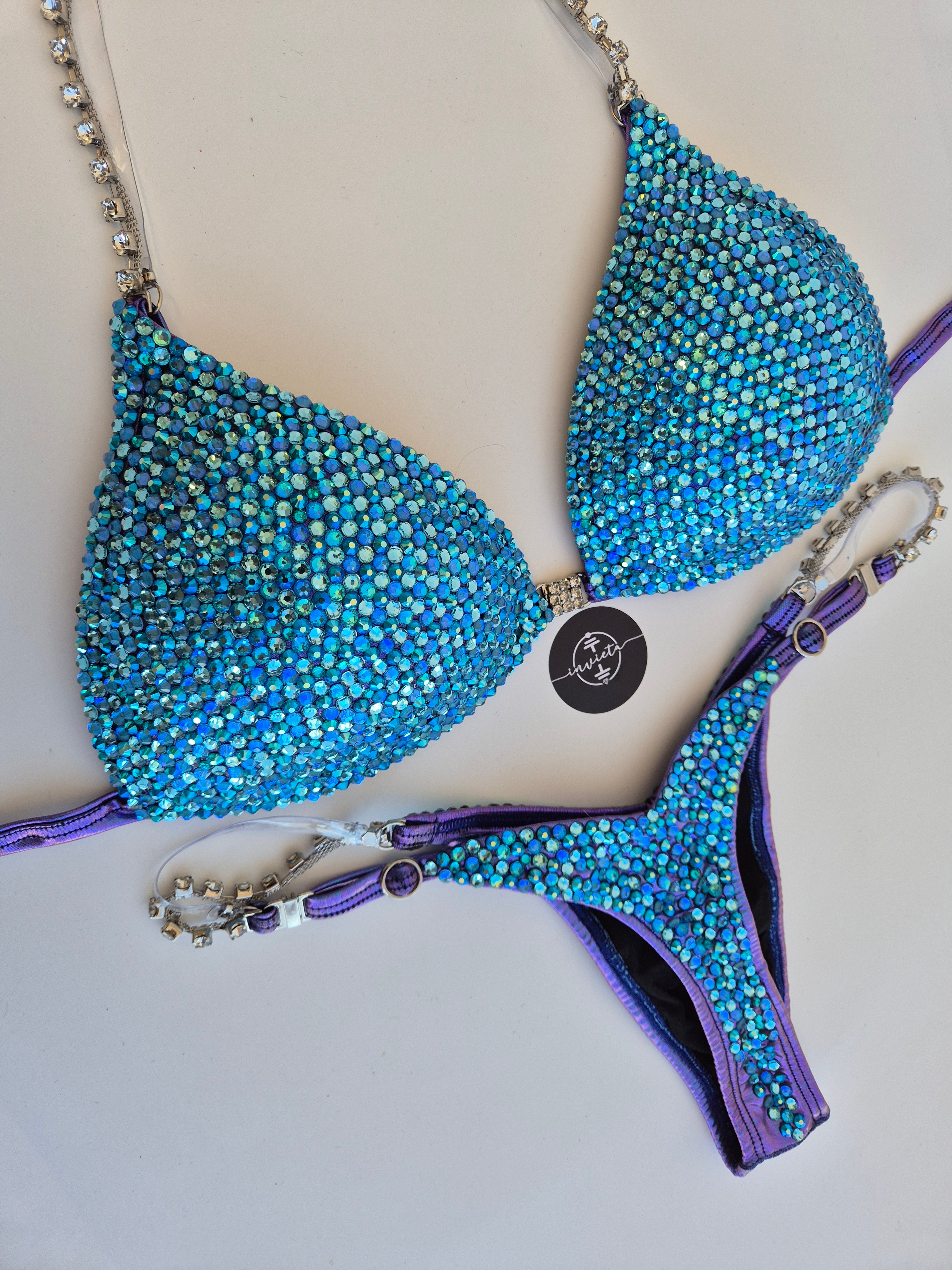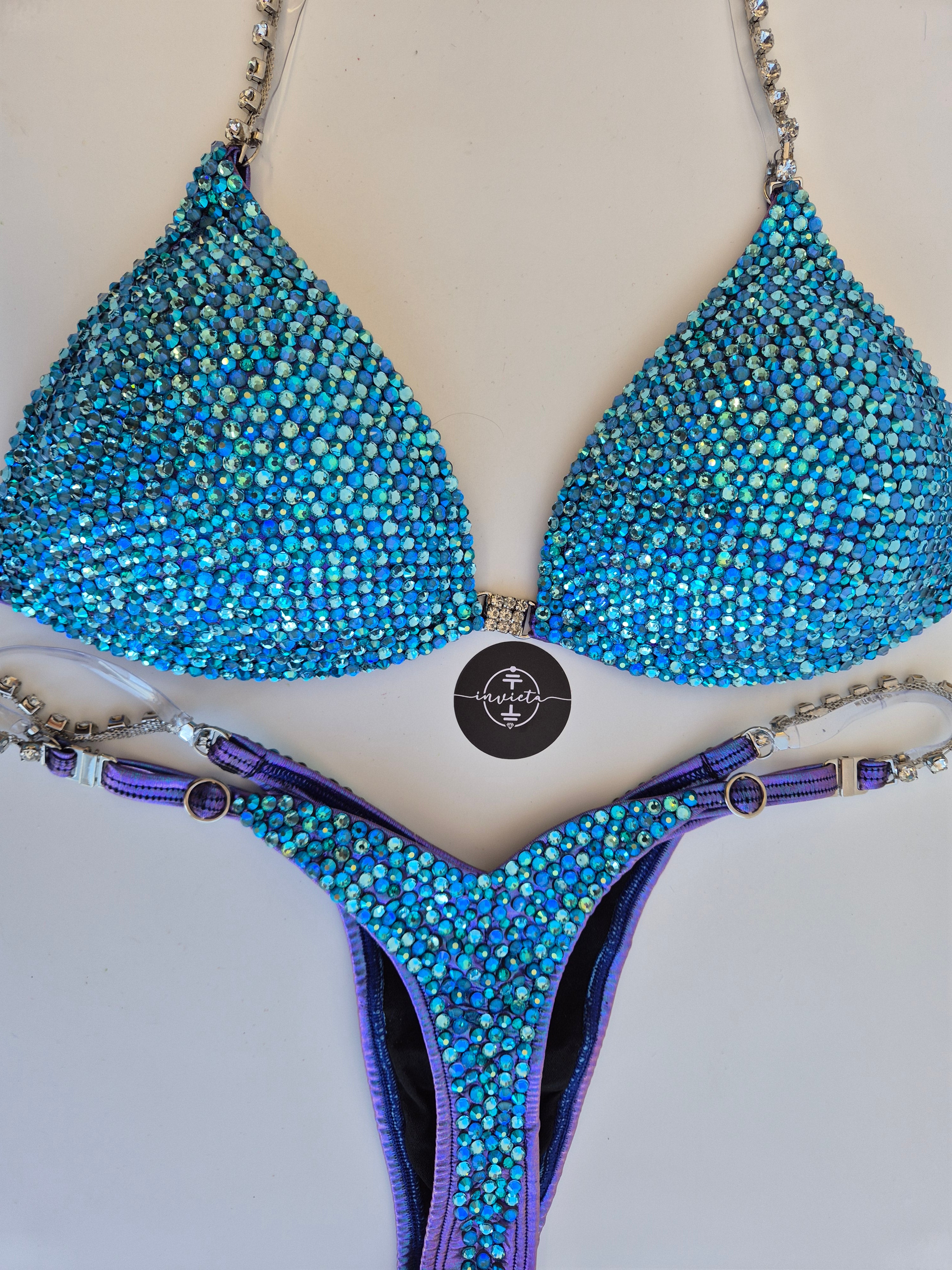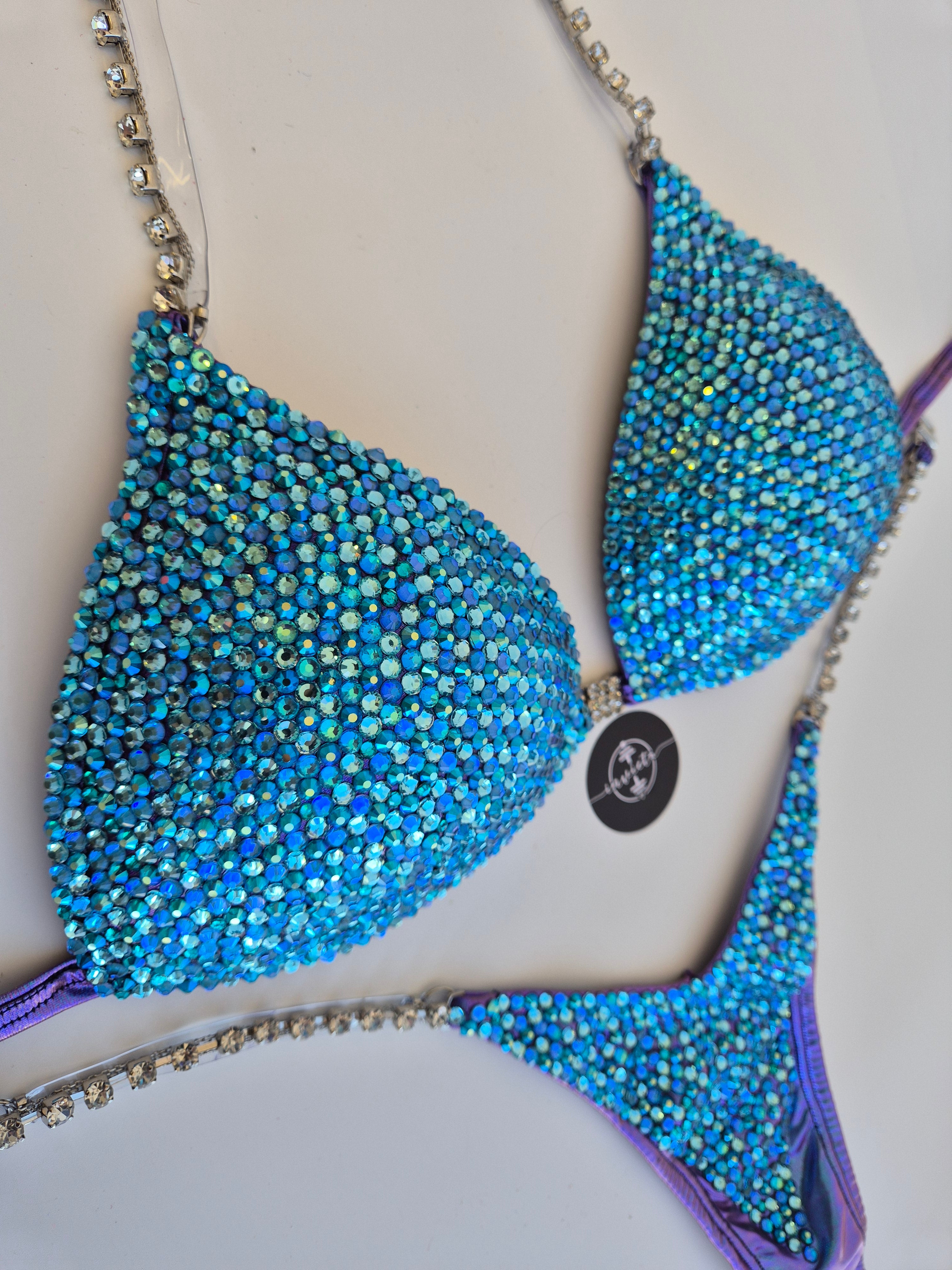 Bordado com cristais em tons variados de Azul.